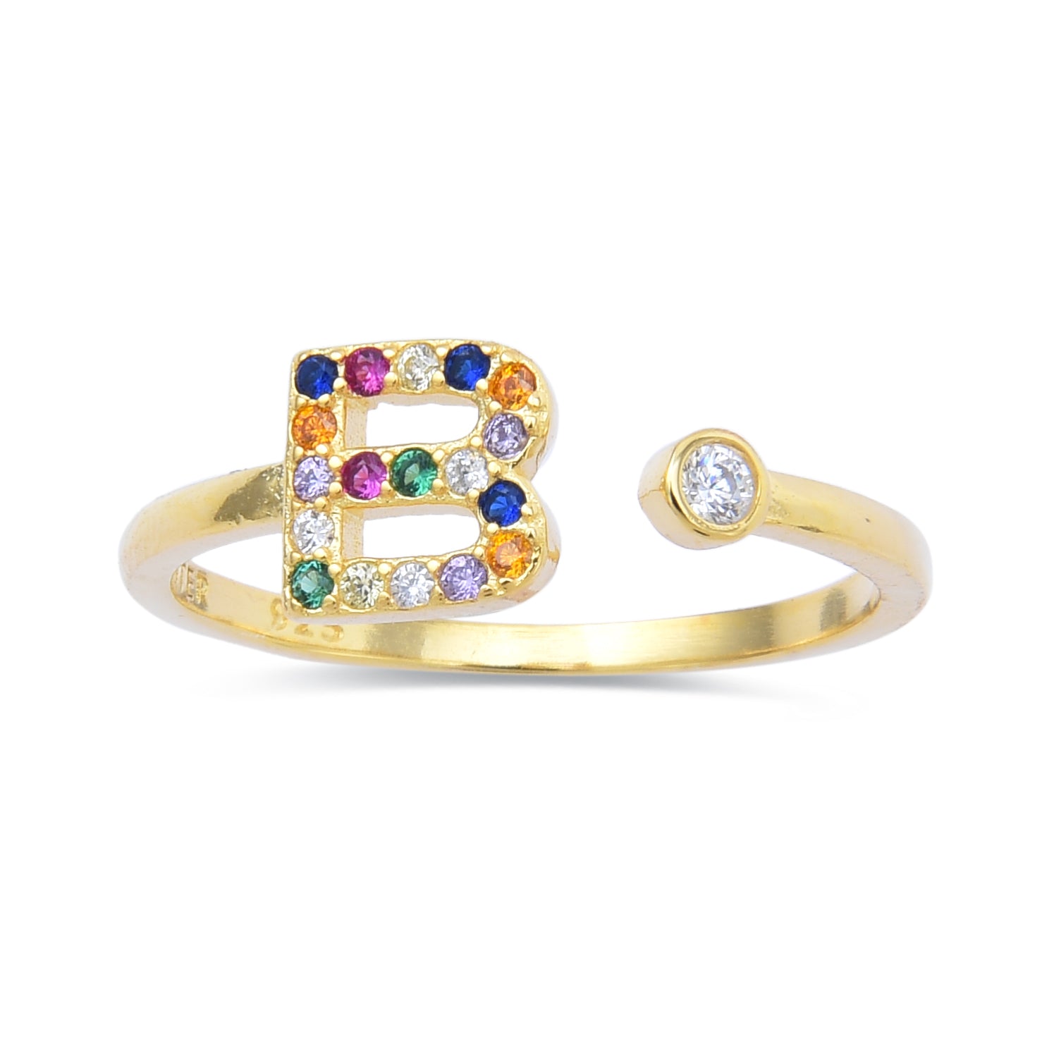 Anillo B Plata de Ley 925 y Circonita Multicolor acabado en oro amarillo de 18 Quilates. Además de lograr estilismos para trotar por el mundo nuestros diseños marcan la diferencia y consiguen que esa diferencia sea radical. Diseños realizados cuidadosamente a mano con materiales y circonitas brillantes de primera calidad dan vida a un Alfabeto de diferentes tamaños. Su exotismo: iniciales sobre Plata de Ley 925, solo es comparable con su recato. Intuitiva, ponderada acierta cada vez que te lo pones y representa como pocas el carácter urbano más cosmopolita: BE AUTHENTIC (NOT) UNIQUE.