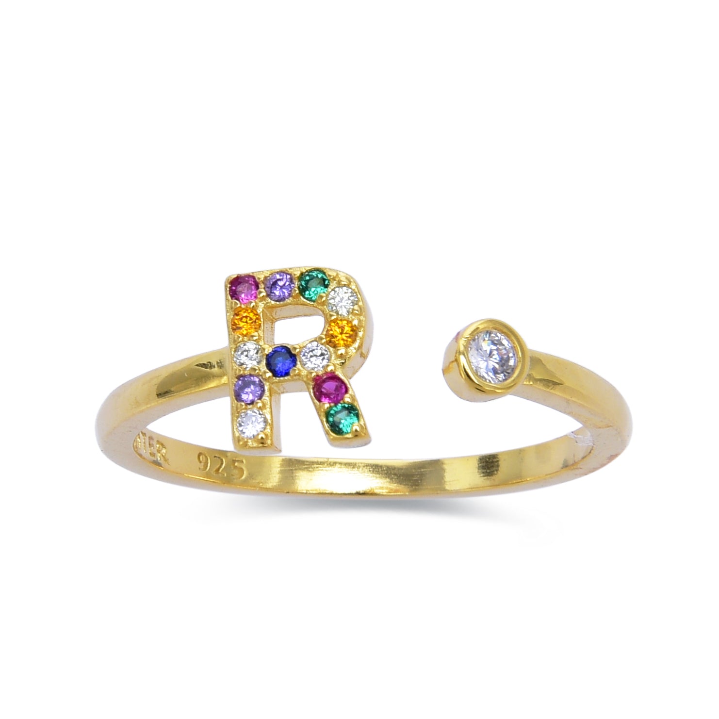 Anillo R Plata de Ley 925 y Circonita Multicolor acabado en oro amarillo de 18 Quilates. Además de lograr estilismos para trotar por el mundo nuestros diseños marcan la diferencia y consiguen que esa diferencia sea radical. Diseños realizados cuidadosamente a mano con materiales y circonitas brillantes de primera calidad dan vida a un Alfabeto de diferentes tamaños. Su exotismo: iniciales sobre Plata de Ley 925, solo es comparable con su recato. Intuitiva, ponderada acierta cada vez que te lo pones y representa como pocas el carácter urbano más cosmopolita: BE AUTHENTIC (NOT) UNIQUE.