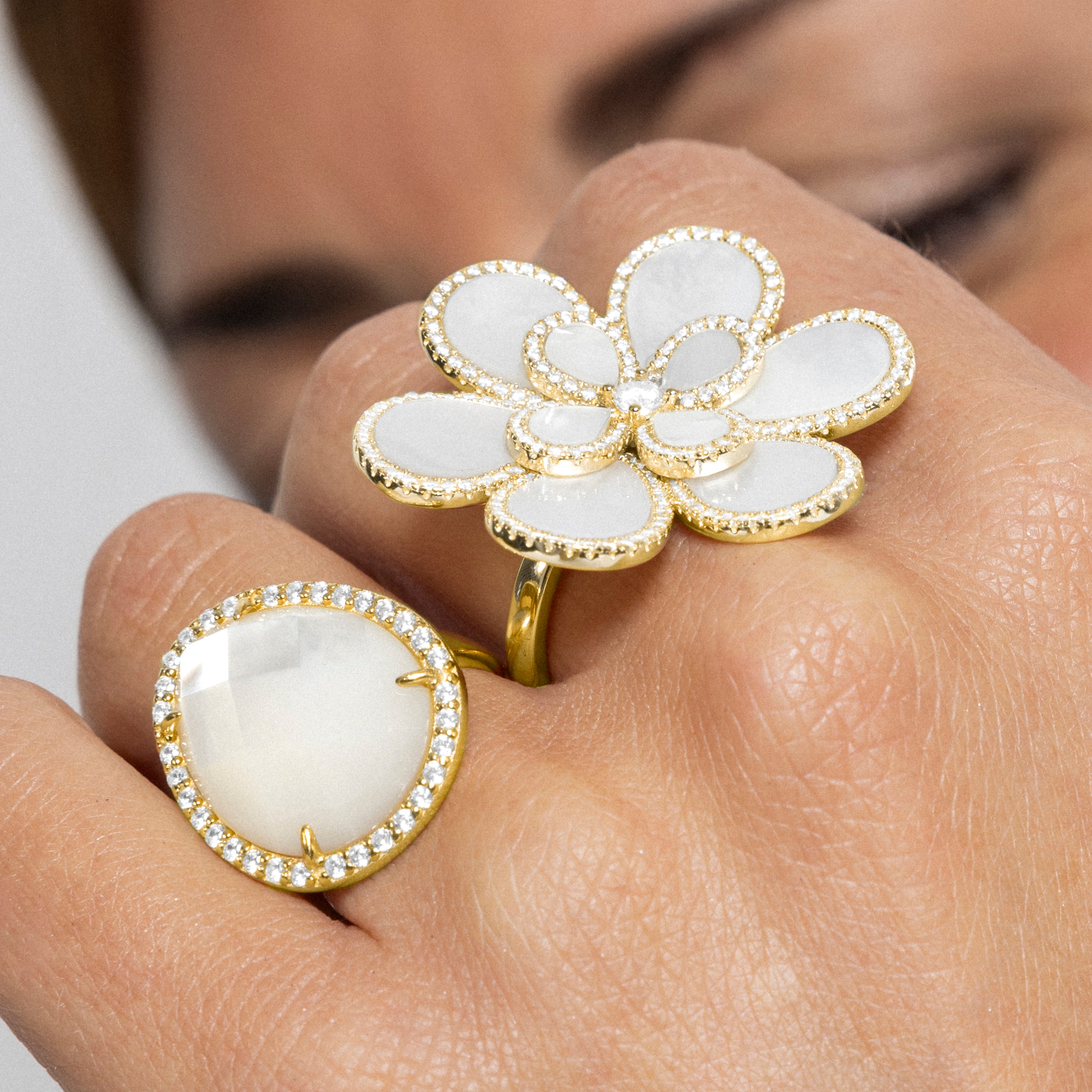 Anillo Karu de Plata de Ley 925 y Madreperla Blanca acabado en oro amarillo de 18k. Momentos para brillar combina a la perfección diseños que se resisten al paso del tiempo con joyas más innovadoras.Joyas elegantes y sofisticadas para brillar en ocasiones especiales.