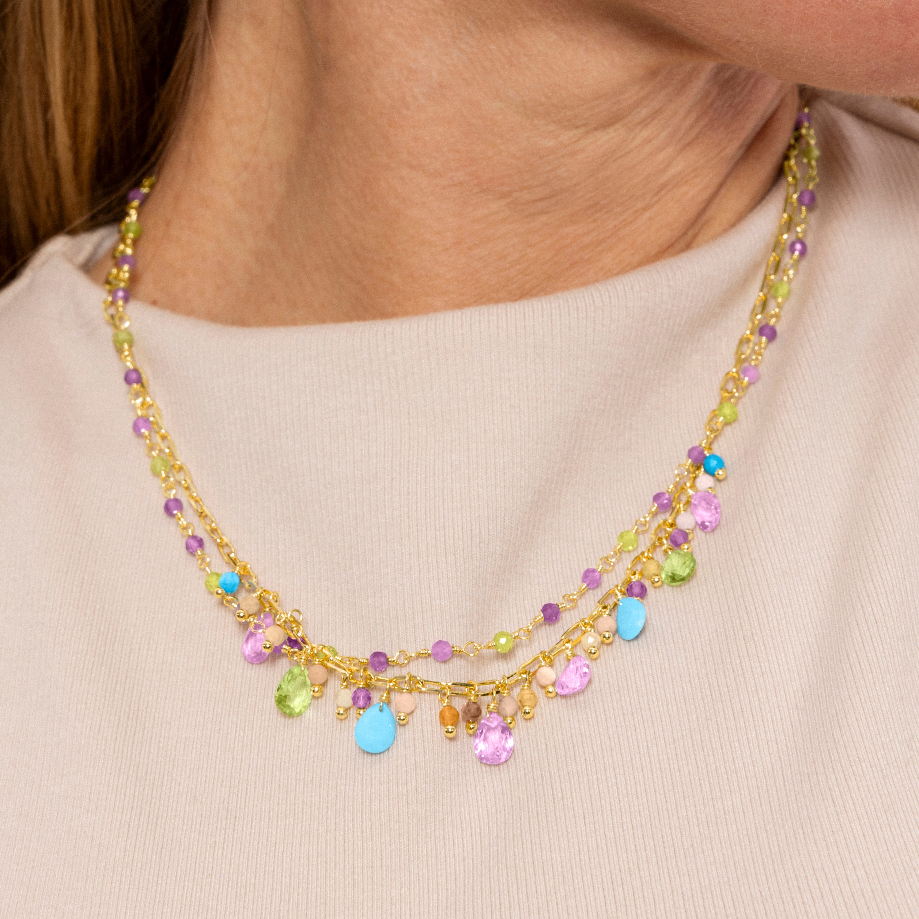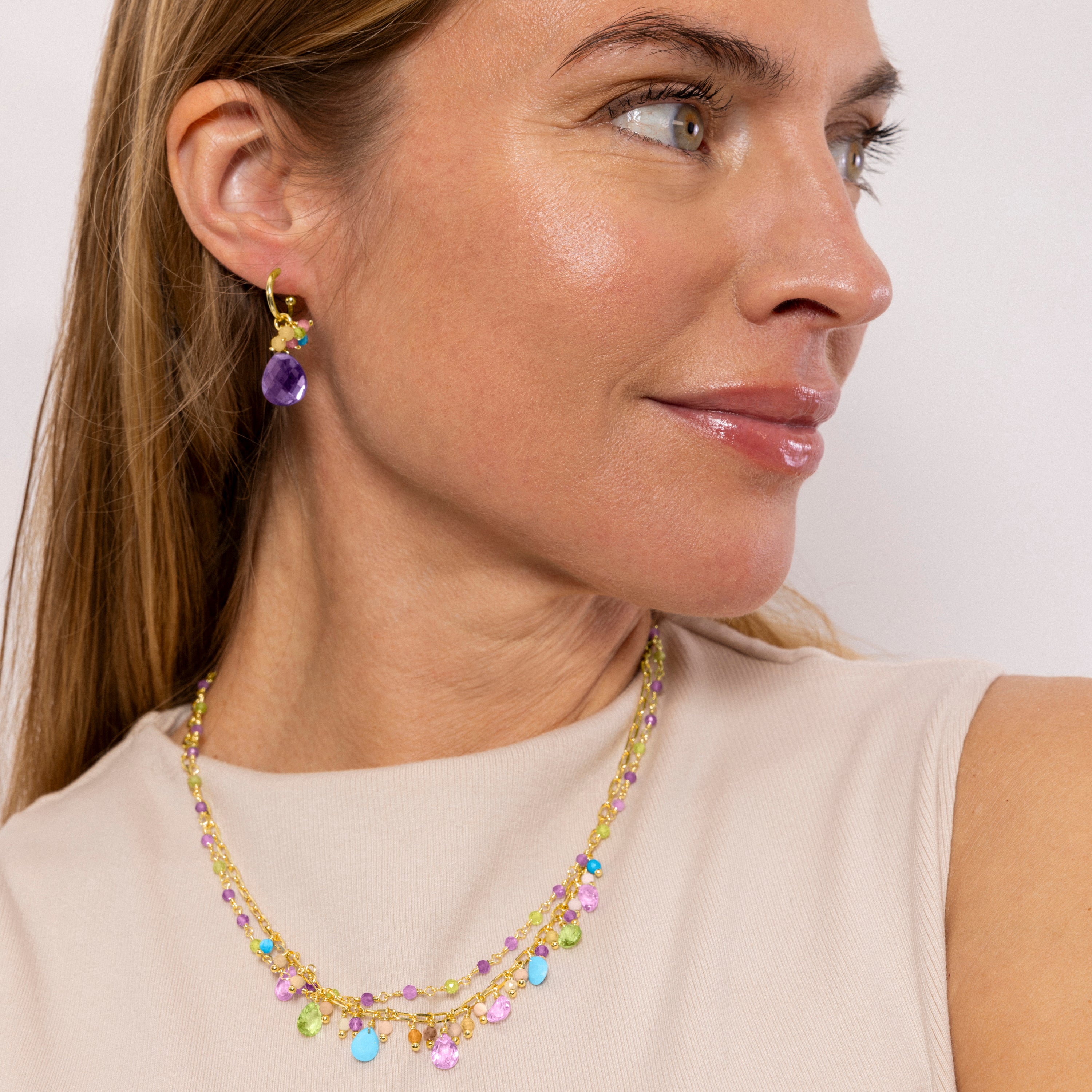 Collar Urilys cierre de Plata de Ley 925, abalorios de metal y Cuarzo Hidrotermal Amatista acabado en oro amarillo de 18k. Atelier transmite tendencia en cada joya, con diseños que se han ido adaptando a la evolución de la moda y de la mujer. Es la línea perfecta para mujeres únicas que quieren aportar un toque de color a su día a día.