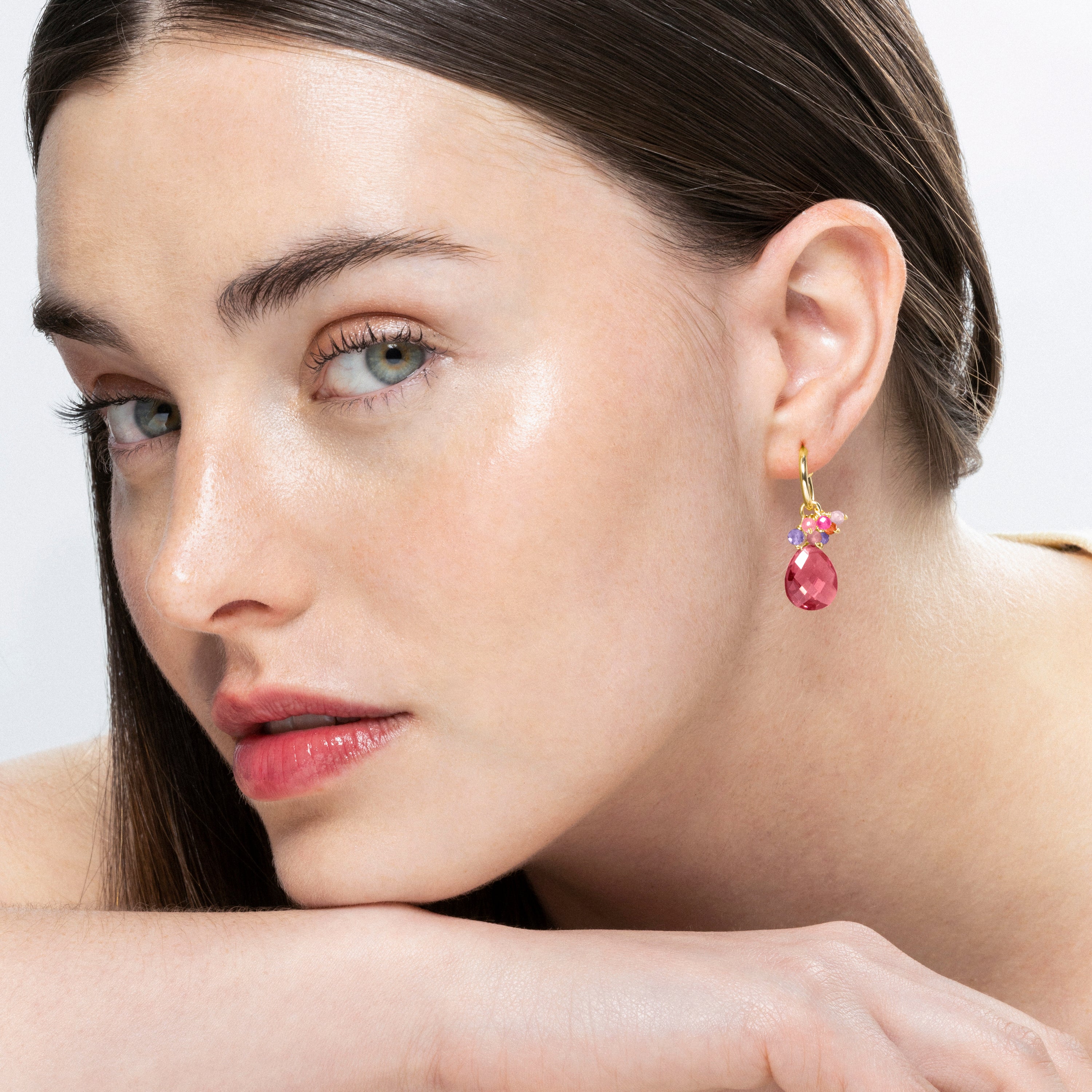 Pendientes Rioka de Plata de Ley 925 y Cuarzo Hidrotermal Frambuesa acabados en oro amarillo de 18k. Atelier transmite tendencia en cada joya, con diseños que se han ido adaptando a la evolución de la moda y de la mujer. Es la línea perfecta para mujeres únicas que quieren aportar un toque de color a su día a día.