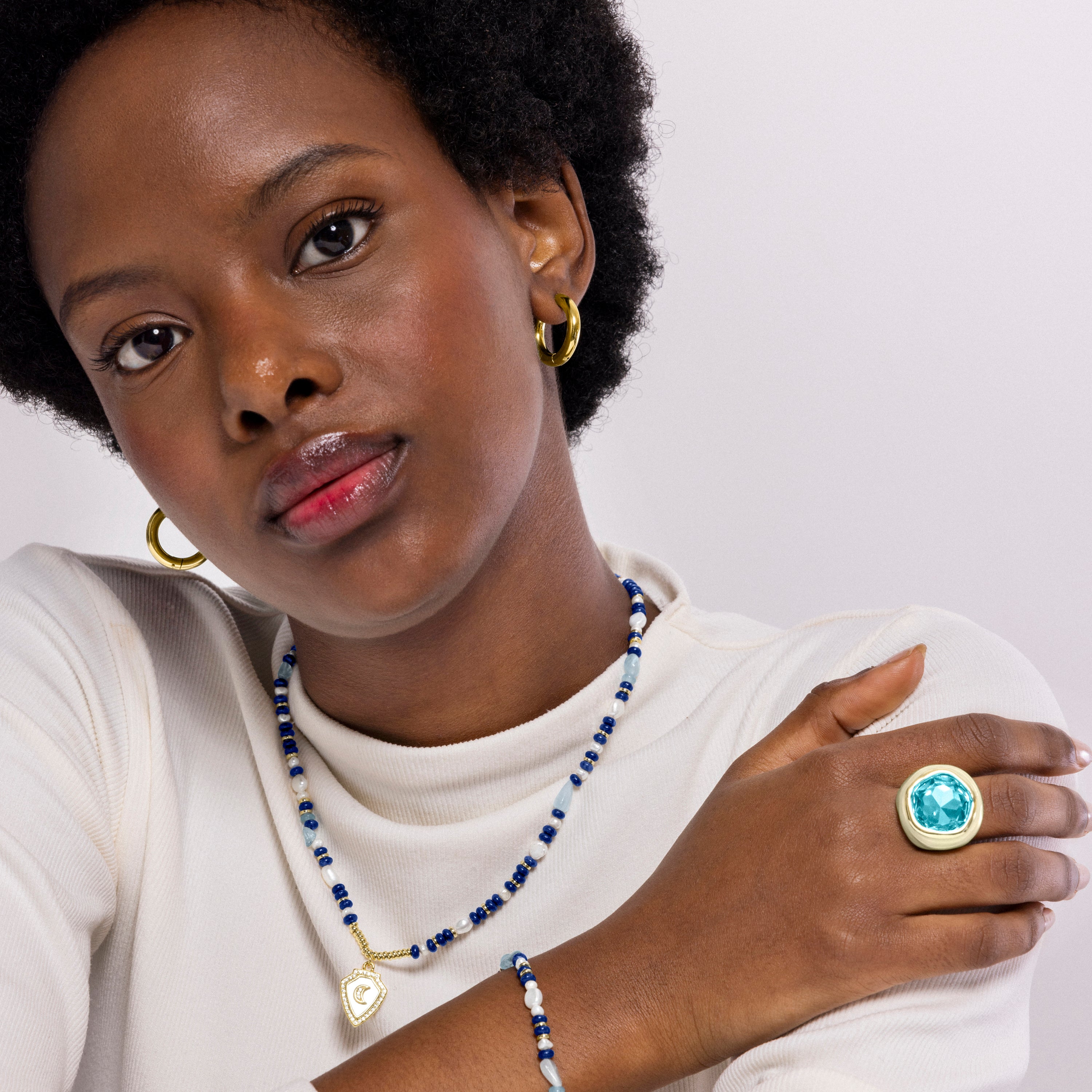 Collar Menya cierre de Plata de Ley 925, abalorios de metal y Lapislazuli Natural acabado en oro amarillo de 18k. Trendy representa las tendencias clave en el mundo de la moda. Nuestra línea más espontanea, con un marcado espíritu moderno que concentra en joyas repletas de color entre las que destaca el uso de piedras naturales y diseños en forma de amuletos y talismanes.