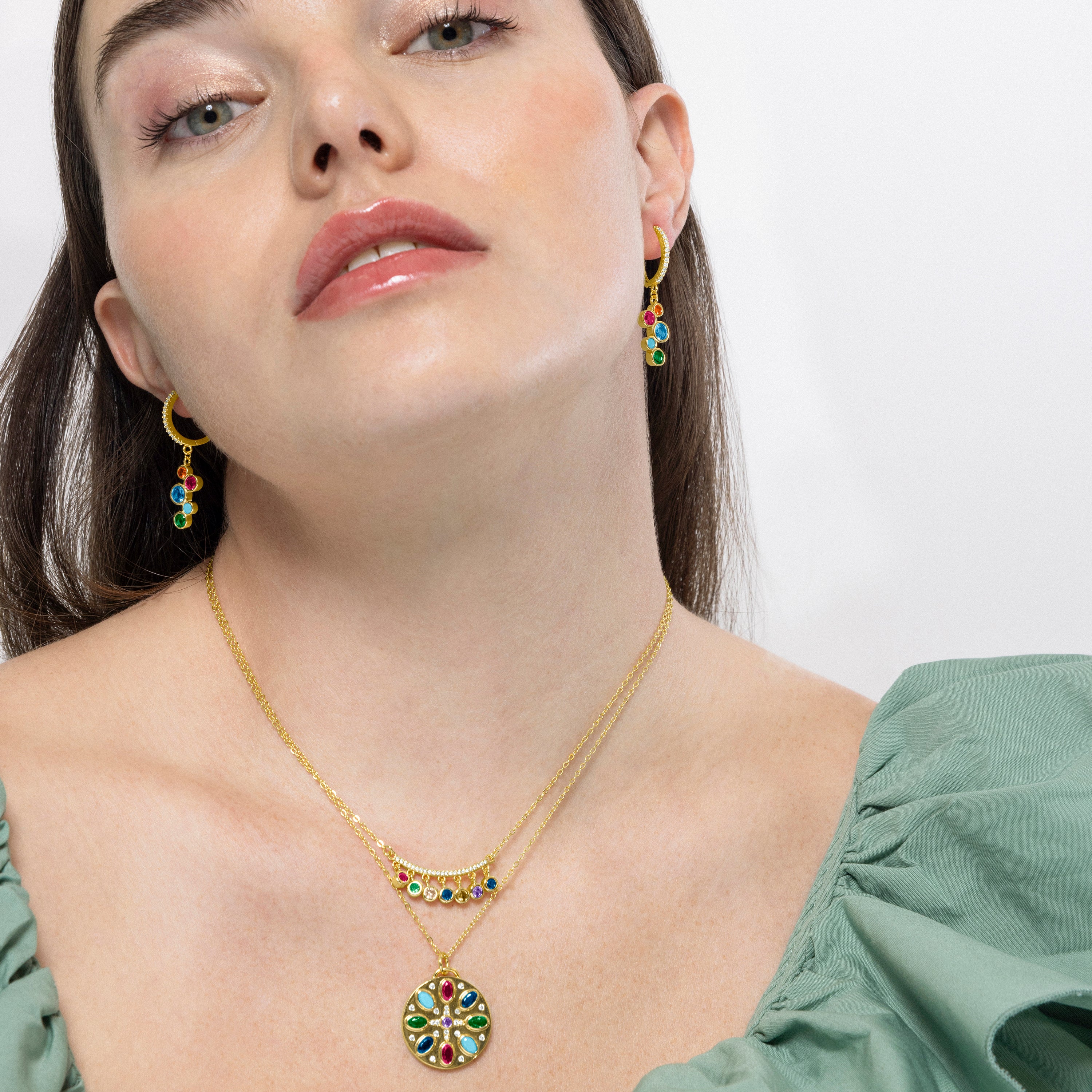 Collar Vithea cadena de Plata de Ley 925, colgante de metal y Circonita Multicolor acabado en oro amarillo de 18k. Trendy representa las tendencias clave en el mundo de la moda. Nuestra línea más espontanea, con un marcado espíritu moderno que concentra en joyas repletas de color entre las que destaca el uso de piedras naturales y diseños en forma de amuletos y talismanes.