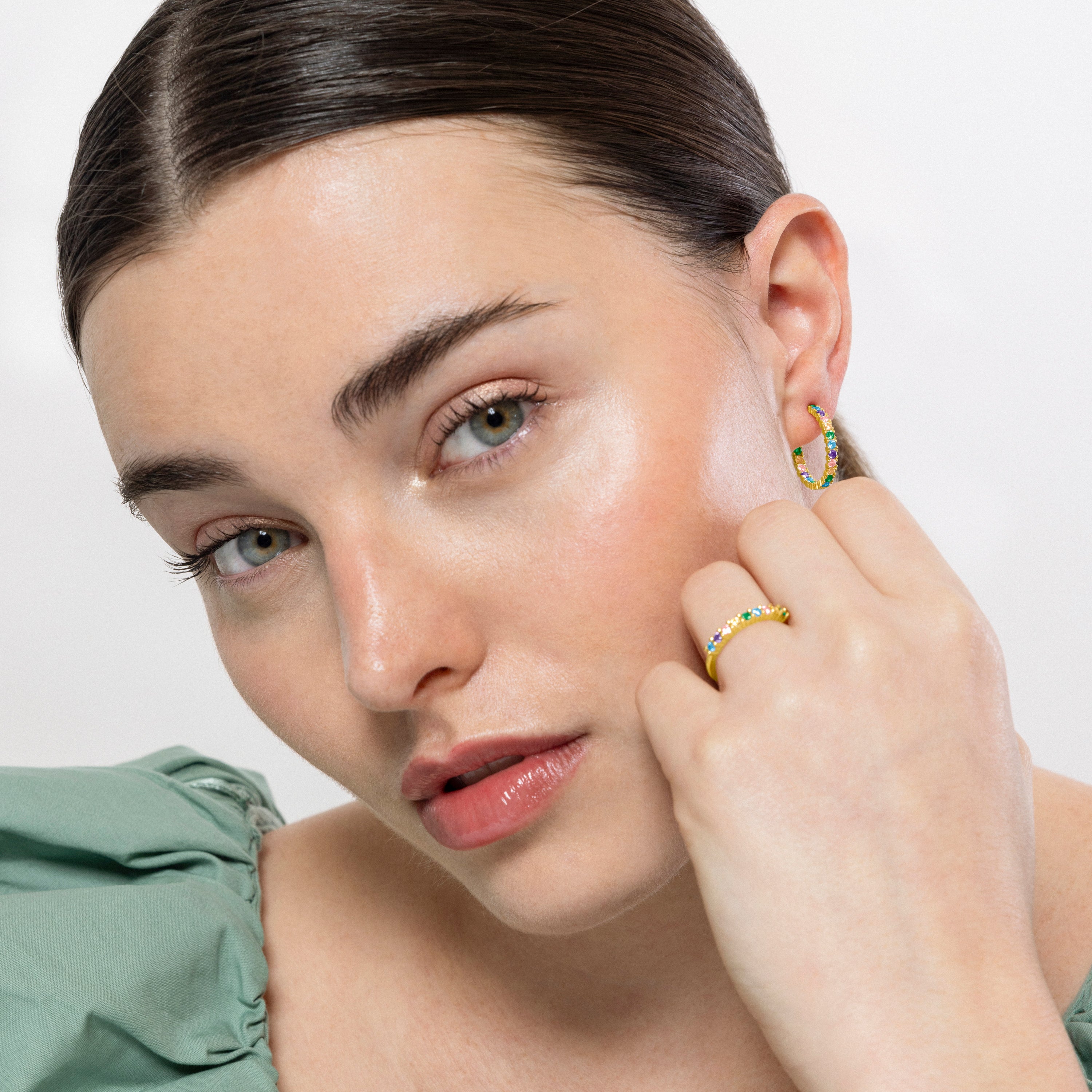 Pendientes Iotha de Plata de Ley 925 y Circonita Multicolor acabados en oro amarillo de 18k. Atelier transmite tendencia en cada joya, con diseños que se han ido adaptando a la evolución de la moda y de la mujer. Es la línea perfecta para mujeres únicas que quieren aportar un toque de color a su día a día.