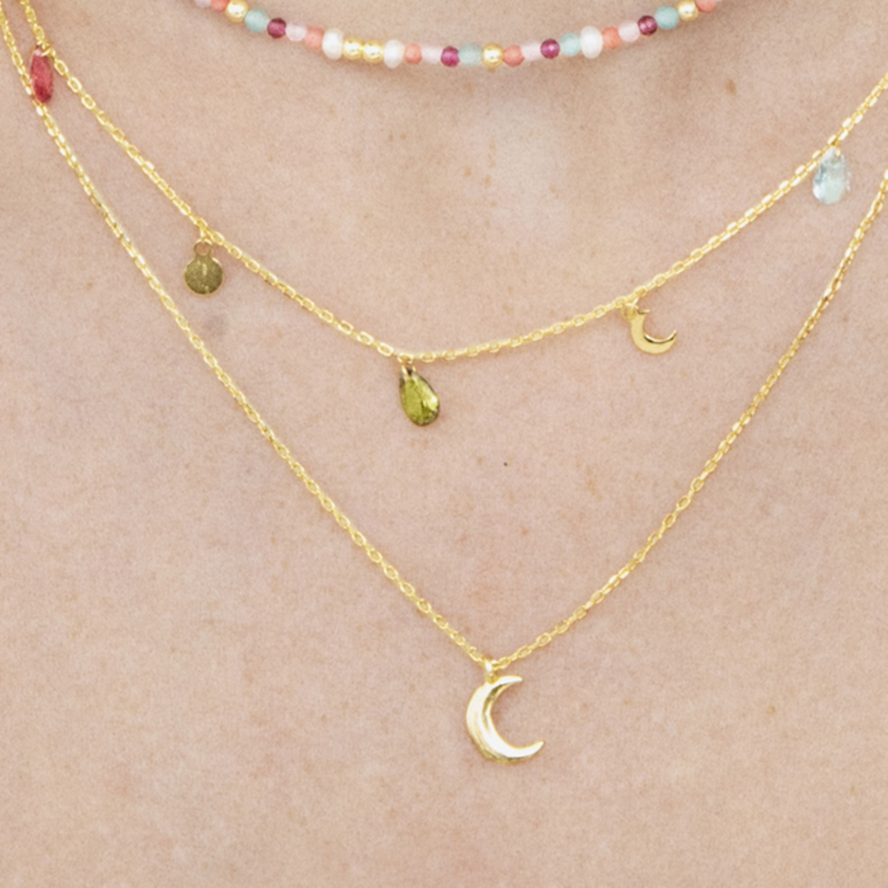 Collar crescent de plata de ley 925 con acabado en baño de oro amarillo de 18 quilates. Trendy representa las tendencias clave en el mundo de la moda. Nuestra línea más espontanea, con un marcado carácter boho y espíritu moderno que concentra en joyas repletas de color entre las que destaca el uso de piedras naturales y diseños en forma de amuletos y talismanes.