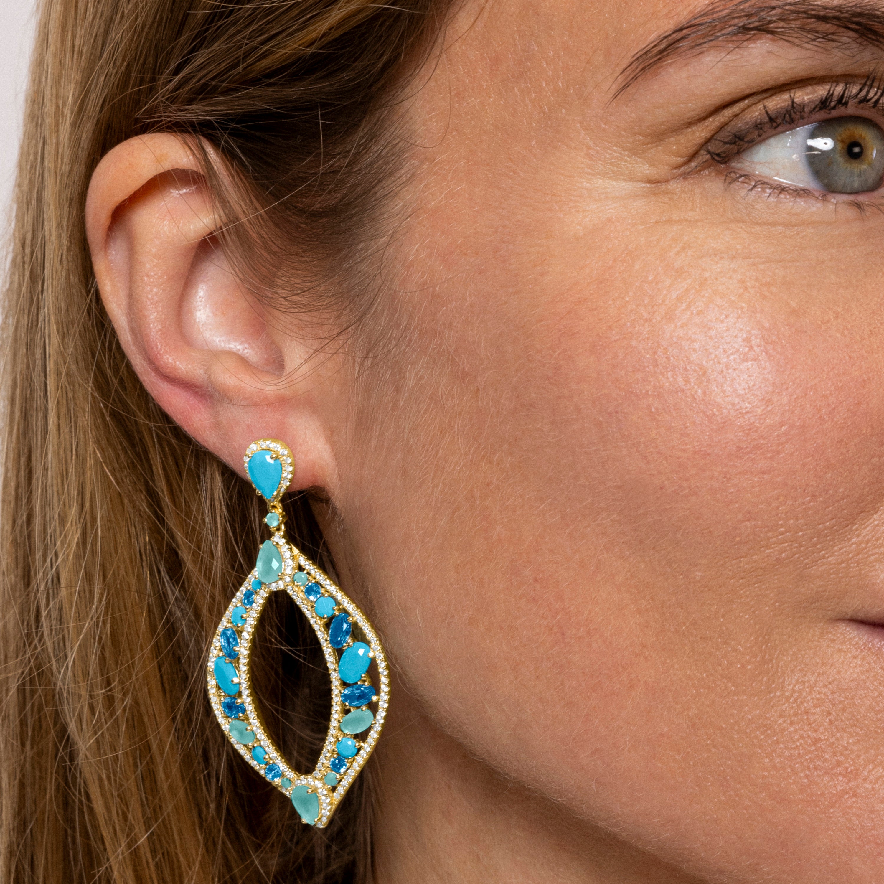Pendientes Wondru de Plata de Ley 925 y Cuarzo Hidrotermal Azul Claro acabados en oro amarillo de 18k. Atelier transmite tendencia en cada joya, con diseños que se han ido adaptando a la evolución de la moda y de la mujer. Es la línea perfecta para mujeres únicas que quieren aportar un toque de color a su día a día.