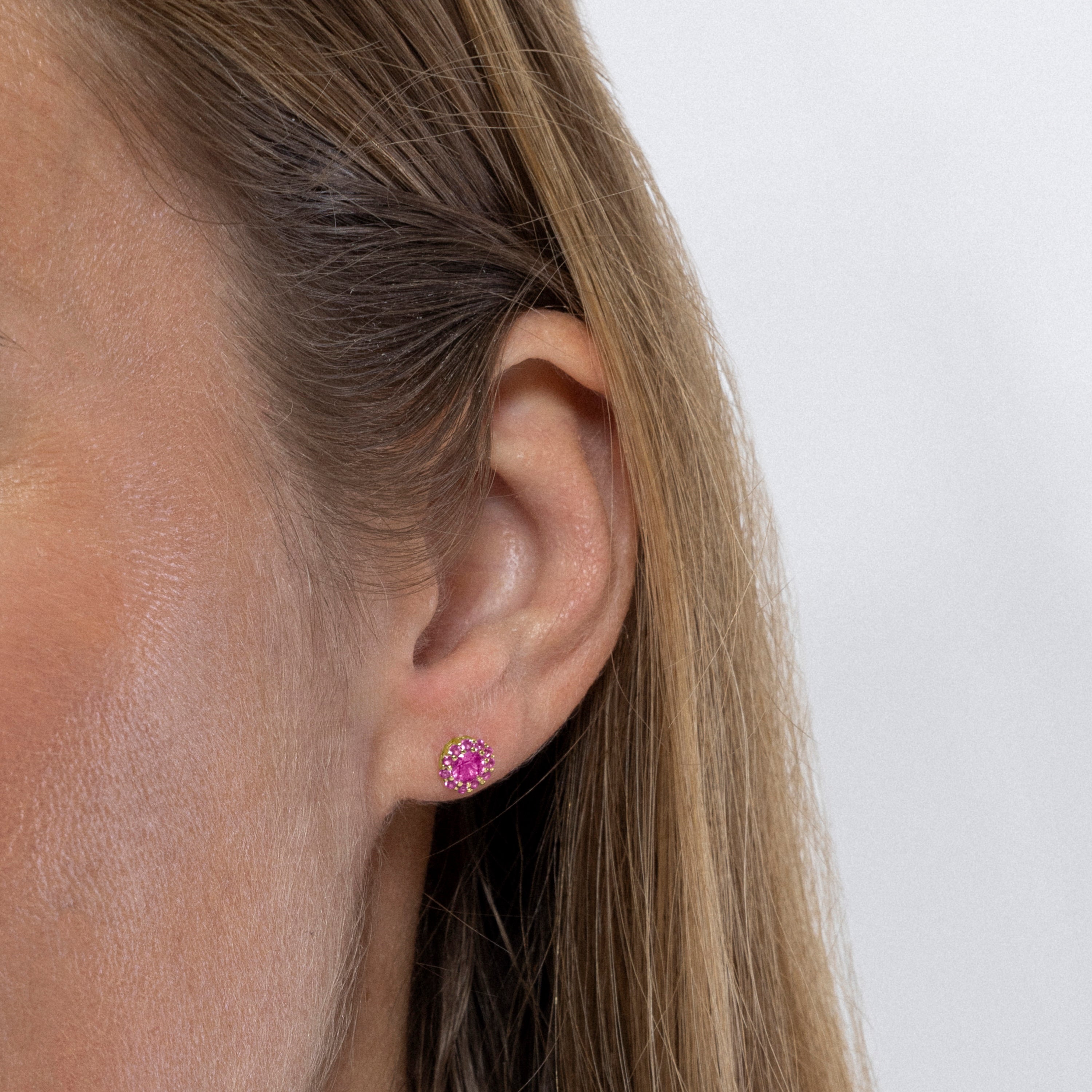 Pendientes Hafai de Plata de Ley 925 y Circonita Rosa acabados en oro amarillo de 18k. Atelier transmite tendencia en cada joya, con diseños que se han ido adaptando a la evolución de la moda y de la mujer. Es la línea perfecta para mujeres únicas que quieren aportar un toque de color a su día a día.