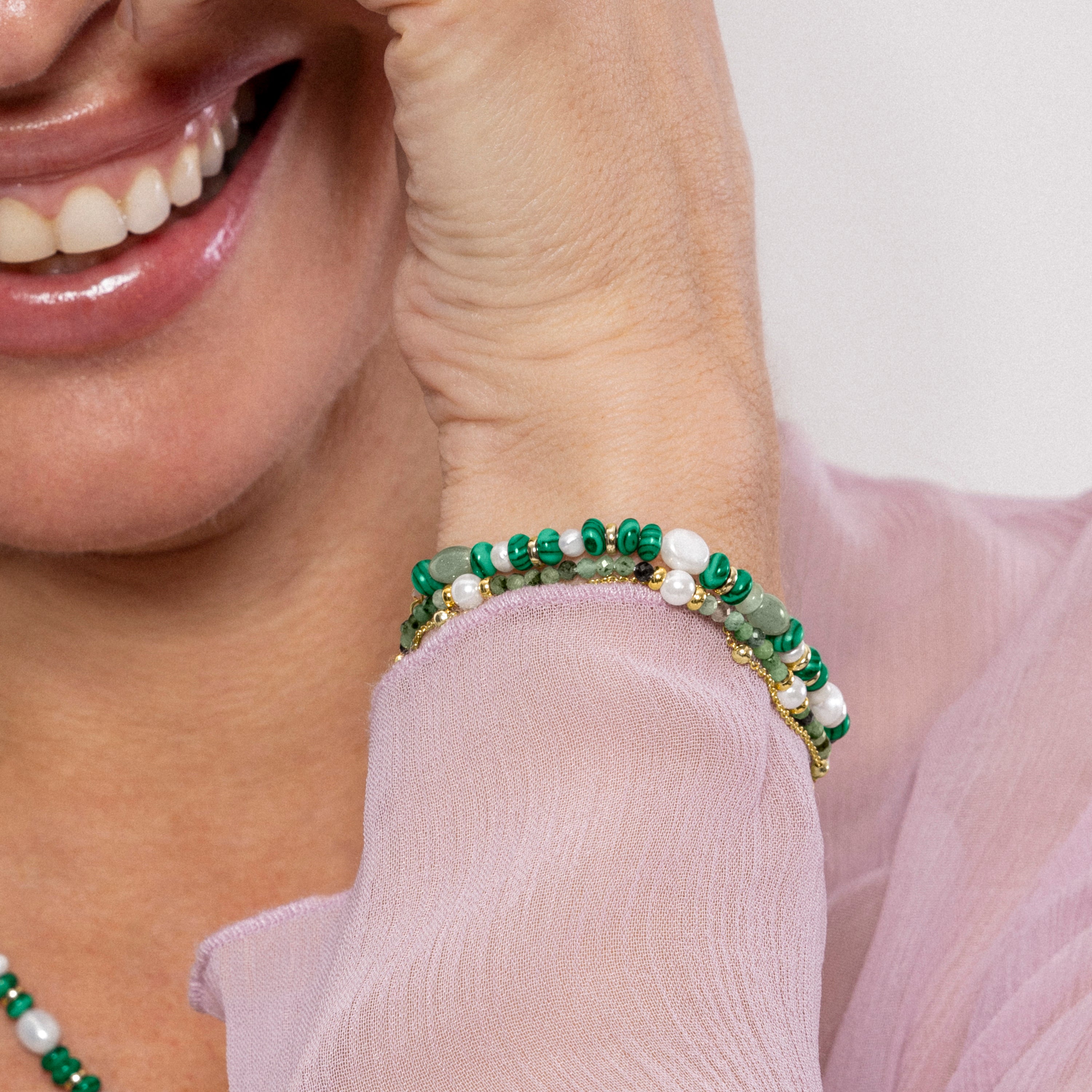 Pulsera Haylma cierre de Plata de Ley 925, abalorios de metal y Malaquita acabada en oro amarillo de 18k. Trendy representa las tendencias clave en el mundo de la moda. Nuestra línea más espontanea, con un marcado espíritu moderno que concentra en joyas repletas de color entre las que destaca el uso de piedras naturales y diseños en forma de amuletos y talismanes.