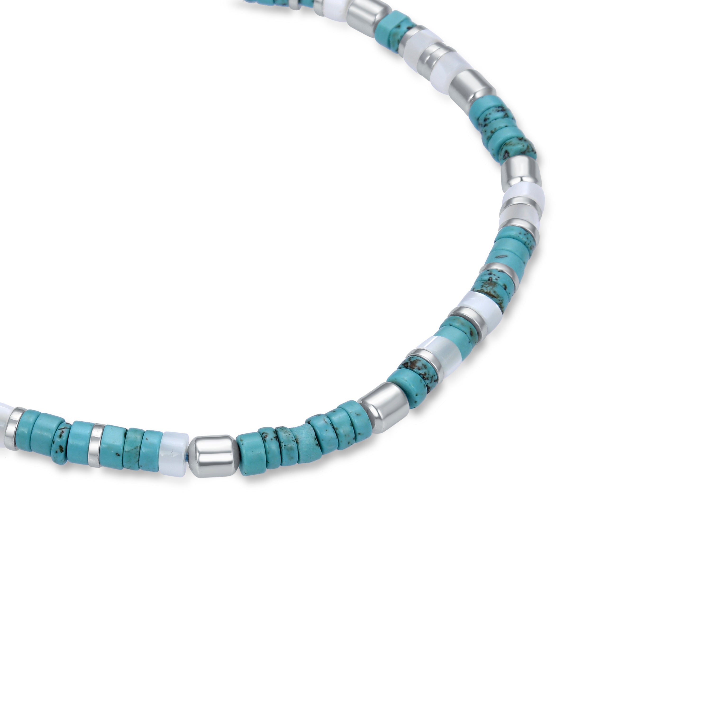 Pulsera Zadir de acabado en Rodio y Turquesa. Es momento de conocer la mayor virtud de este diseño: el poder transformar un look clásico en una propuesta cargada de carácter y personalidad. Diseños realizados cuidadosamente a mano con materiales de primera calidad. El eclecticismo nunca ha sido tan libre y valiente como en esta colección. Arrebatos psicodélicos se agitan para dar paso a joyas que van dejando rastro de excentricidades que van más allá del gusto por las joyas sofisticadas, que dictan sentencia convirtiéndose en piezas clave, el detalle que la eleva: (R)evolución.